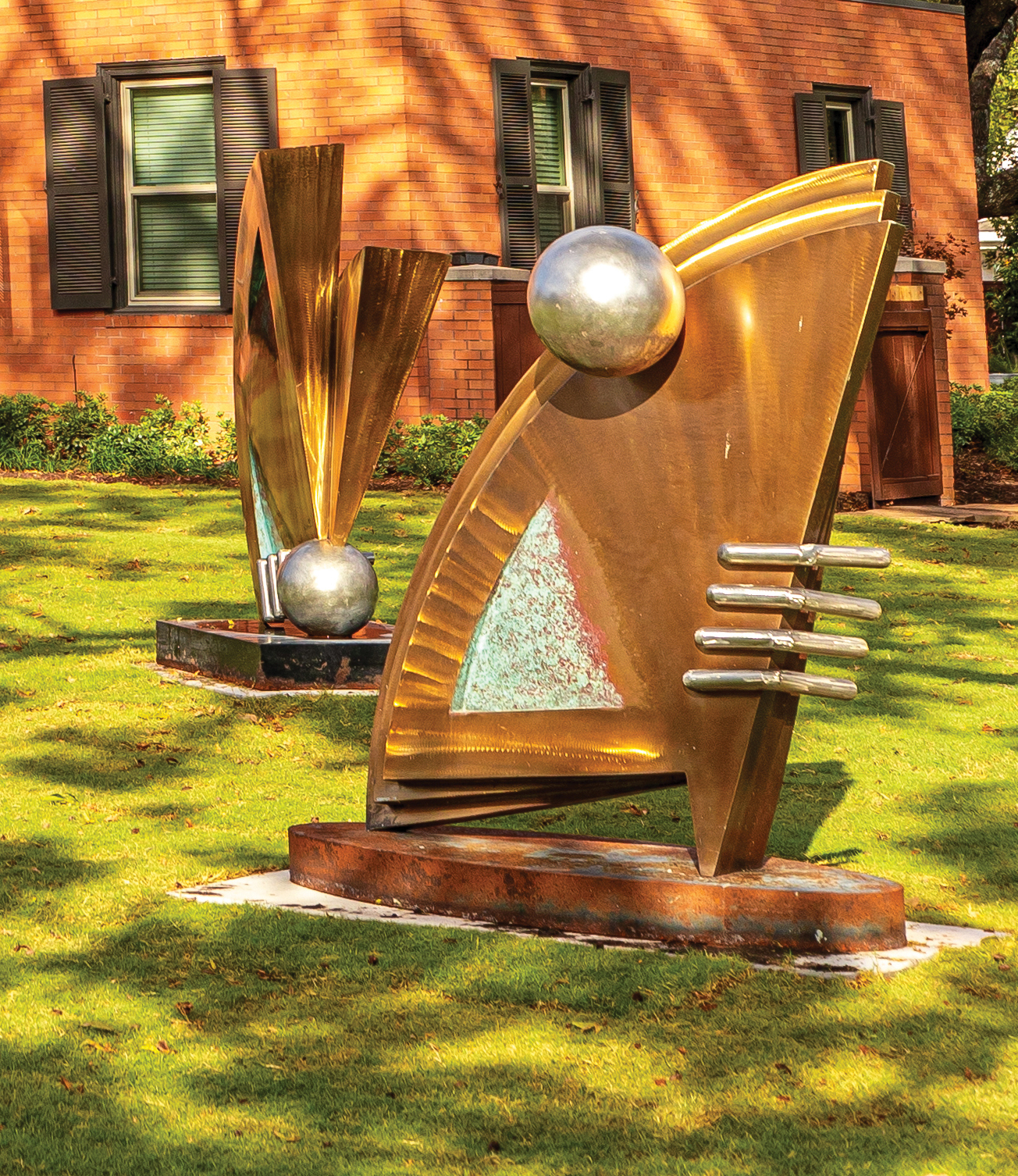 - John, Jay, and John also contributed pieces from their personal art collection—six-foottall bronze and stainless steel sculptures titled “Tailfin Fetish” and “Manifold Grace” fabricated by artist Brett Chomer—to further enrich the home and its grounds.